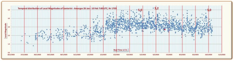 Υπενθυμίζεται ότι το βράδυ της Δευτέρας (10.2.2025) καταγράφηκε ισχυρός σεισμός μεγέθους 5,3 Ρίχτερ. Από εκείνη τη στιγμή, ακολούθησε μια σειρά σεισμών άνω των 4 Ρίχτερ, με τον ισχυρότερο να φτάνει τα 5 Ρίχτερ.