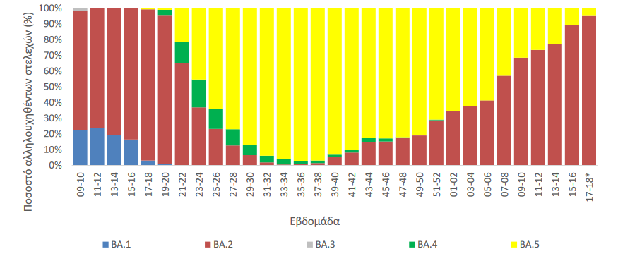 Οι επαναλοιμώξεις οφείλονται στο γεγονός ότι οι μεταλλάξεις της Όμικρον ανακυκλώνονται, τρόπον τινά. Ενώ είχε κυριαρχήσει η Ομικρον2, εν συνεχεία εξαπλώθηκε η Όμικρον5, και τώρα, επανήλθε η Όμικρον2. Κατά τις τελευταίες εβδομάδες όλα τα αλληλουχηθέντα στελέχη ανήκαν στις υποπαραλλαγές ΒΑ.2 και ΒΑ.5 της Όμικρον, με τη ΒΑ.2 να υπερτερεί από την Μάρτιο και μετά, αλλά για λίγο να “κάνει τόπο” για την ΒΑ.5.