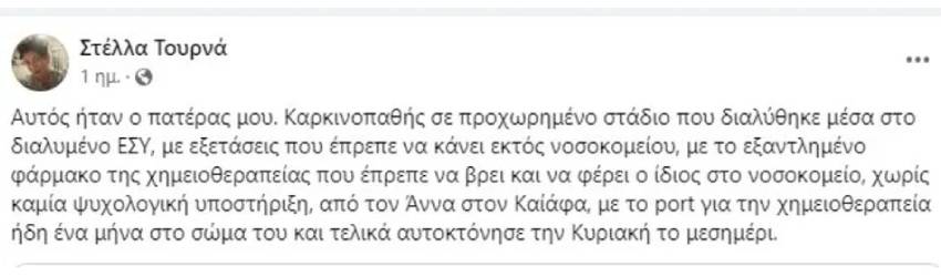 Οι μαρτυρίες των συγγενών του εκλιπόντος δεν αφήνουν περιθώρια παρερμηνείας. Δύο και πλέον μήνες πέρασαν από την αρχική διάγνωση επιθετικού καρκίνου των πνευμόνων μέχρι να πραγματοποιηθεί η αναγκαία εξέταση PET SCAN. Στη συνέχεια δεν βρισκόταν το απαραίτητο φάρμακο, η χορήγηση του απαιτείται για την έναρξη χημειοθεραπείας. Με αναζήτηση του φαρμάκου από την οικογένεια, με αναβολές και ακυρώσεις, ο καρκινοπαθής οδηγήθηκε τελικά σε αδιέξοδο.