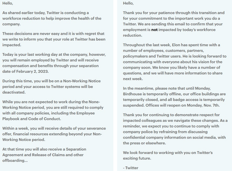 Σύμφωνα με δημοσίευμα του BBC που επικαλείται τον αμερικανικό τεχνολογικό ιστότοπο Insider, το μήνυμα ηλεκτρονικού ταχυδρομείου που πράγματι εστάλη στους άτυχους υπαλλήλους ανέφερε λακωνικά: «Σήμερα είναι η τελευταία σας εργάσιμη ημέρα στην εταιρεία». Στη συνέχεια εξηγούσε ότι θα λάβουν την αποζημίωση τους, μέχρι τις 2 Φεβρουαρίου του 2023. Το ποσό της αποζημίωσης θα τους κοινοποιηθεί εντός μίας εβδομάδας.