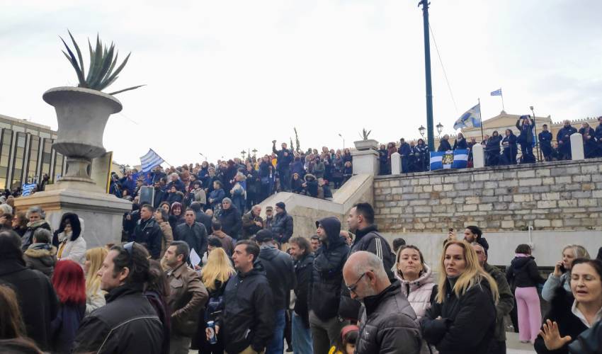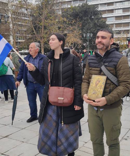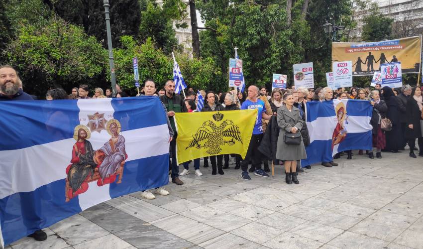 Γαλανόλευκες σημαίες κάθε μεγέθους, βυζαντινές, σημαίες με την Πλατυτέρα στο κέντρο, με το αστέρι της Βεργίνας, με εικονίσματα στα χέρια, με σταυρούς, αφίσες με πανό, ένα πλήθος θεοσεβούμενων ανθρώπων γέμισε την πλατεία Συντάγματος, ανταποκρινόμενο στο κάλεσμα διαμαρτυρίας κατά του γάμου των ομόφυλων του κόμματος “Νίκη, των “Πατριωτών” και της αστικής μη κερδοσκοπικής εταιρίας που δραστηριοποιείται εδώ και 12 χρόνια, της “Εστίας Πατερικών Μελετών”.