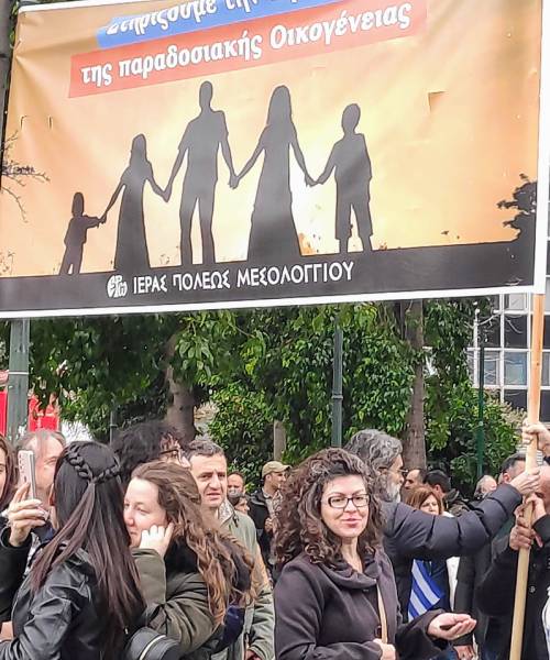 Άνθρωποι με συντηρητική εμφάνιση, με εικόνες Αγίων στα μπουφάν τους, με καταγγελτικά πανό κατά των Ελλήνων πολιτικών, των ομοφυλόφιλων, με εστίαση στο τρίπτυχο “πατρίδα θρησκεία οικογένεια”, αρκετοί με “ήρεμο φανατισμό” και φυλλάδια που, εν ονόματι της Ορθοδοξίας, προβάλλουν ένα διχαστικό κι απαξιωτικό λόγο για μέλη του κοινωνικού συνόλου, με υπακοή στους ομιλητές, λαϊκούς και κληρικούς, με ψαλμωδίες και ιδιαίτερα συνθήματα, έδωσαν ένα ηχηρό παρόν κατά του προς ψήφιση νομοσχεδίου που επίκειται κι αφορά τον γάμο των ομόφυλων ζευγαριών.