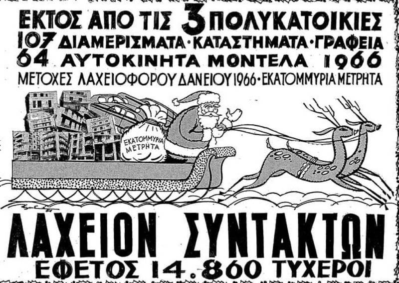 Για την ιστορία και μακριά από ‘μένα, το Πρωτοχρονιάτικο Λαχείο, γνωστό ως “Λαχείο Συντακτών”, εκδιδόταν από την Ένωση Συντακτών και κυκλοφόρησε για πρώτη φορά το 1927. Την δεκαετία του ’60 μοίραζε πολυκατοικίες και το 1967 αντικαταστάθηκε από το Κρατικό Λαχείο Κοινωνικής Αντίληψης.
