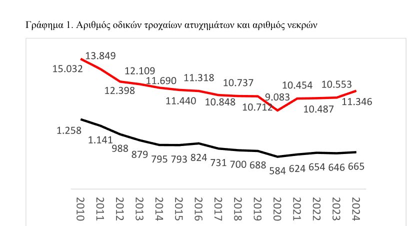 Στο Γράφημα 1 παρουσιάζονται τα στοιχεία αναφορικά με την εξέλιξη των τροχαίων και τον αριθμό των νεκρών από το 2010 έως το 2024 (συνολικά 172.056 ΟΤΑ). Ο αριθμός αυτός αντιστοιχεί σε 11.470 ανά έτος. Ο υψηλότερος αριθμός έλαβε χώρα το 2010 (15.032) και ο χαμηλότερος το 2020 (9.083) – οφείλεται κυρίως στα μέτρα αντιμετώπισης του κορονοϊού. Η εξέλιξη ακολουθεί γενικά μία πτωτική τάση.