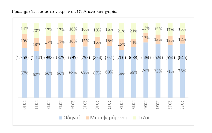 Στο Γράφημα 2 παρουσιάζεται ο αριθμός των νεκρών λόγω ΟΤΑ ανάλογα με το αν ήταν οδηγοί, μεταφερόμενοι (επιβάτες) ή πεζοί. Οι αριθμοί στις παρενθέσεις σε αυτό και στα ακόλουθα γραφήματα αφορούν το σύνολο των νεκρών ανά έτος. Συνολικά την περίοδο 2010- 2023 έχασαν την ζωή τους 7.657 οδηγοί (67,7%), 1.729 μεταφερόμενοι (15,3%) και 1.919 πεζοί (17%). Πιο συγκεκριμένα οι οδηγοί τροχοφόρων οχημάτων εμφανίζουν ποσοστό νεκρών, το οποίο κυμαίνεται ανάμεσα στο 62% (2011) και 74% (2020).