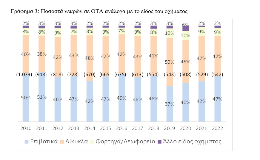 Όσον αφορά τον αριθμό των νεκρών ανάλογα με το είδος του οχήματος, διαπιστώνει κανείς στο Γράφημα 3 πως η πλειοψηφία των θυμάτων παρατηρείται στα επιβατικά. Στο σύνολο της περιόδου 2010-2022 τo 46% των νεκρών (4.099) βρισκόταν εντός επιβατικών οχημάτων, ενώ το 43% των νεκρών (3.787) αφορούσε δίκυκλα (κυρίως μοτοσυκλέτες, μοτοποδήλατα, και ελάχιστα ποδήλατα). Επίσης ένα 8% των νεκρών (732) βρισκόταν εντός φορτηγών και λεωφορείων και ένα 3 % (224) σε άλλο είδος οχήματος (μάλλον γεωργικά).