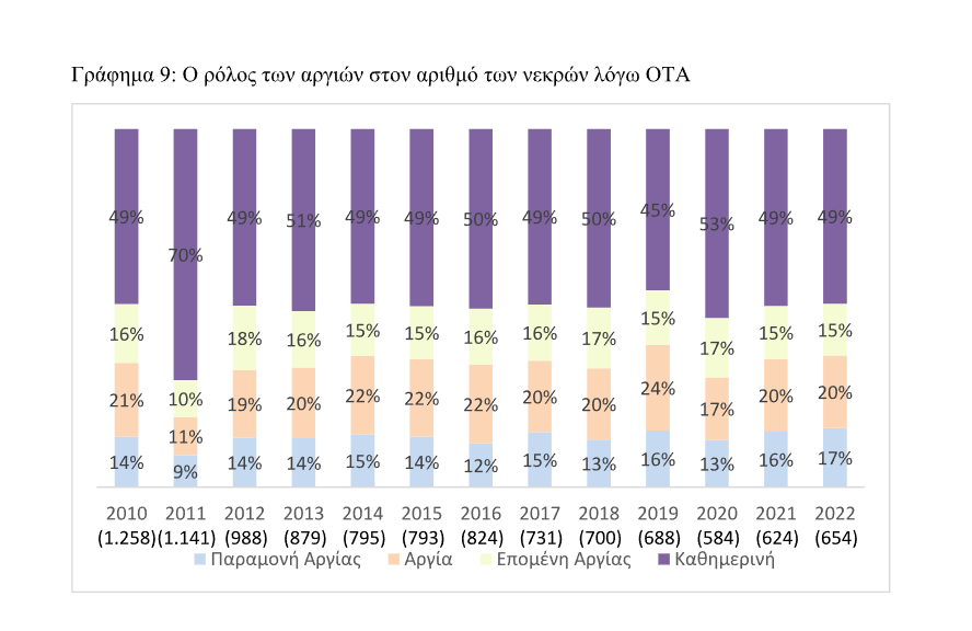 Εκτός από τη ημέρα της εβδομάδας σημαντικό ρόλο στον αριθμό των νεκρών σε ΟΤΑ παίζει και το είδος της ημέρας, όπως φαίνεται στο Γράφημα 10. Την περίοδο 2010-2022 έχασαν την ζωή τους 2.071 (19%) άνθρωποι κατά την διάρκεια μιας αργίας, ενώ περίπου 50% των νεκρών αυτής της περιόδου έλαβε χώρα μια αργία και τις σχετιζόμενες με την αργία ημέρες, δηλαδή την παραμονή και την επομένη μιας αργίας. Για το 2022 στο σύνολο των 654 νεκρών το 51 % (335) έχασαν την ζωή τους σε μια αργία και τις παραπλήσιες σε αυτή ημέρες (παραμονή αργίας-επομένη αργίας).