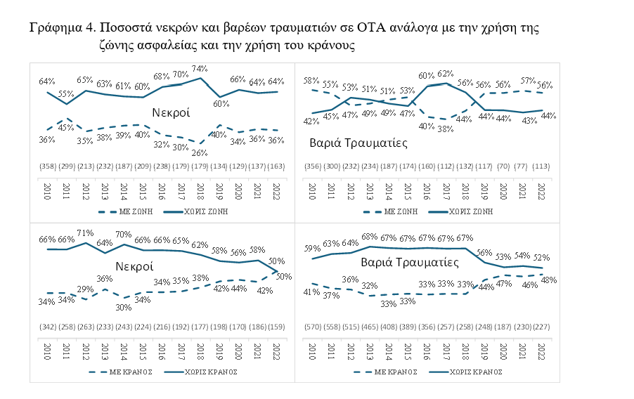 Σε σχέση με το είδος του οχήματος και τον αριθμό των νεκρών και βαρέων τραυματιών περιγράφεται στο Γράφημα 4 ο ρόλος της χρήσης της ζώνης ασφαλείας (για όλα τα οχήματα εκτός δικύκλων) και του κράνους (αφορά μόνο δίκυκλα). Το κλισέ «η ζώνη σώζει ζωές» φαίνεται ξεκάθαρα στο πάνω αριστερά τμήμα του Γραφήματος 4 πως ισχύει. Σε κάθε έτος της περιόδου 2010-2022 το ποσοστό των νεκρών σε τροχαία που έκανε χρήση της ζώνης είναι μικρότερο από το ποσοστό των νεκρών που δεν έκανε χρήση της.