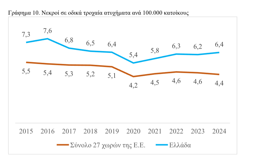 Για το 2024 ο αριθμός των νεκρών ανά 100.000 κατοίκους στην χώρα μας ήταν (6,4 ανά 100.000) 45% υψηλότερος από τον αντίστοιχο αριθμό των νεκρών στο σύνολο των 27 της ΕΕ (4,4 ανά 100.000). Είναι λοιπόν επιτακτική η ανάγκη να αντιμετωπιστεί η κατάσταση στους δρόμους της χώρας μας και να μειωθεί ακόμα περισσότερο ο αριθμός των θυμάτων.