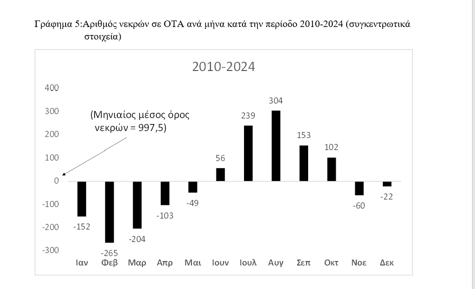 Σε σχέση με την μηνιαία κατανομή των νεκρών σε ΟΤΑ στο σύνολο της περιόδου 2010-2024 φαίνεται ξεκάθαρα στο Γράφημα 5 πως ο αριθμός τους κατά τους μήνες Ιούνιο έως και Οκτώβριο είναι σαφώς υψηλότερος του μηνιαίου μέσου όρου των 997,5 νεκρών. Ο πιο επικίνδυνος μήνας θνησιμότητας λόγω ΟΤΑ είναι ο Αύγουστος με 1301 (997,5 + 304) νεκρούς. Αντιθέτως, οι μήνες Νοέμβριος έως και Μάιος παρουσιάζουν μια θνησιμότητα που υπολείπεται του μηνιαίου μέσο όρου των 997,5 νεκρών. Ο μήνας με την χαμηλότερη θνησιμότητα είναι ο Φεβρουάριος με 733 νεκρούς.