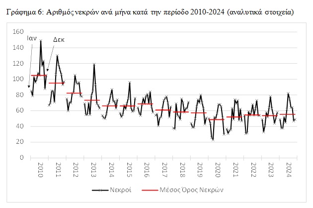 Ομοίως, τον μήνα Δεκέμβριο καταγράφηκε τα έτη 2010, 2011, 2014, 2015, 2017, 2018 και 2023 υψηλότερος του εκάστοτε μηνιαίου μέσου όρου αριθμός θανάτων. Αντιθέτως, χαμηλότερος του μηνιαίου μέσου όρου αριθμός νεκρών λόγω ΟΤΑ έλαβε χώρα τον μήνα Ιούνιο τα έτη 2018 και 2021, καθώς επίσης και τον μήνα Αύγουστο το 2022. Ομοίως, ο μήνας Σεπτέμβριος εμφάνιζε χαμηλότερη του εκάστοτε μηνιαίου μέσου όρου θνησιμότητα λόγω ΟΤΑ τα έτη 2015 και 2018, όπως επίσης και ο Οκτώβριος τα έτη 2013, 2015, 2021 και 2023.