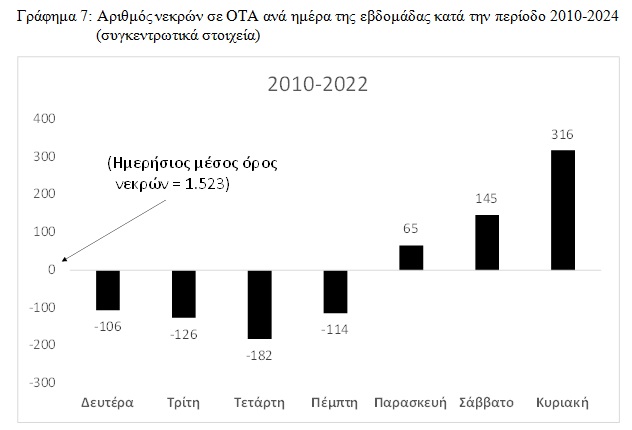 Όσον αφορά την ημέρα της εβδομάδας, τα συγκεντρωτικά στοιχεία στο Γράφημα 8 δείχνουν καθαρά πως οι ημέρες Παρασκευή, Σάββατο και Κυριακή χαρακτηρίζονται από έναν υψηλότερο του μέσου όρου αριθμό νεκρών από ΟΤΑ. Για παράδειγμα, στο σύνολο των Κυριακών της περιόδου 2010-2022 έχουν χάσει την ζωή τους 1.839 (= 1.523 + 316) συνάνθρωποί μας. Αντιθέτως, τις υπόλοιπες μέρες της εβδομάδας ο αριθμός των νεκρών είναι χαμηλότερος του μέσου όρου με την Τετάρτη να εμφανίζει τον χαμηλότερο αριθμό νεκρών στο σύνολο της περιόδου 2010-2022.