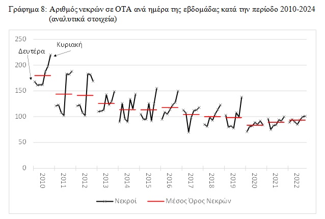 Υπάρχουν όμως και εξαιρέσεις όσον αφορά την κατανομή στον αριθμό των νεκρών λόγω ΟΤΑ. Όπως π.χ. φαίνεται στο Γράφημα 9 οι Δευτέρες των ετών 2017 και 2019 είχαν υψηλότερη του αντίστοιχου μέσου όρου θνησιμότητα. Το ίδιο ίσχυε και για τις Τρίτες των ετών 2014, 2017 και 2022. Ομοίως και οι Πέμπτες των ετών 2013, 2015 και 2020 χαρακτηρίζονται από έναν υψηλότερο του εκάστοτε μέσου όρου αριθμό νεκρών. Χαμηλότερο αριθμό νεκρών από τον αντίστοιχο μέσο όρο είχαν οι Παρασκευές των ετών 2013 και 2015.