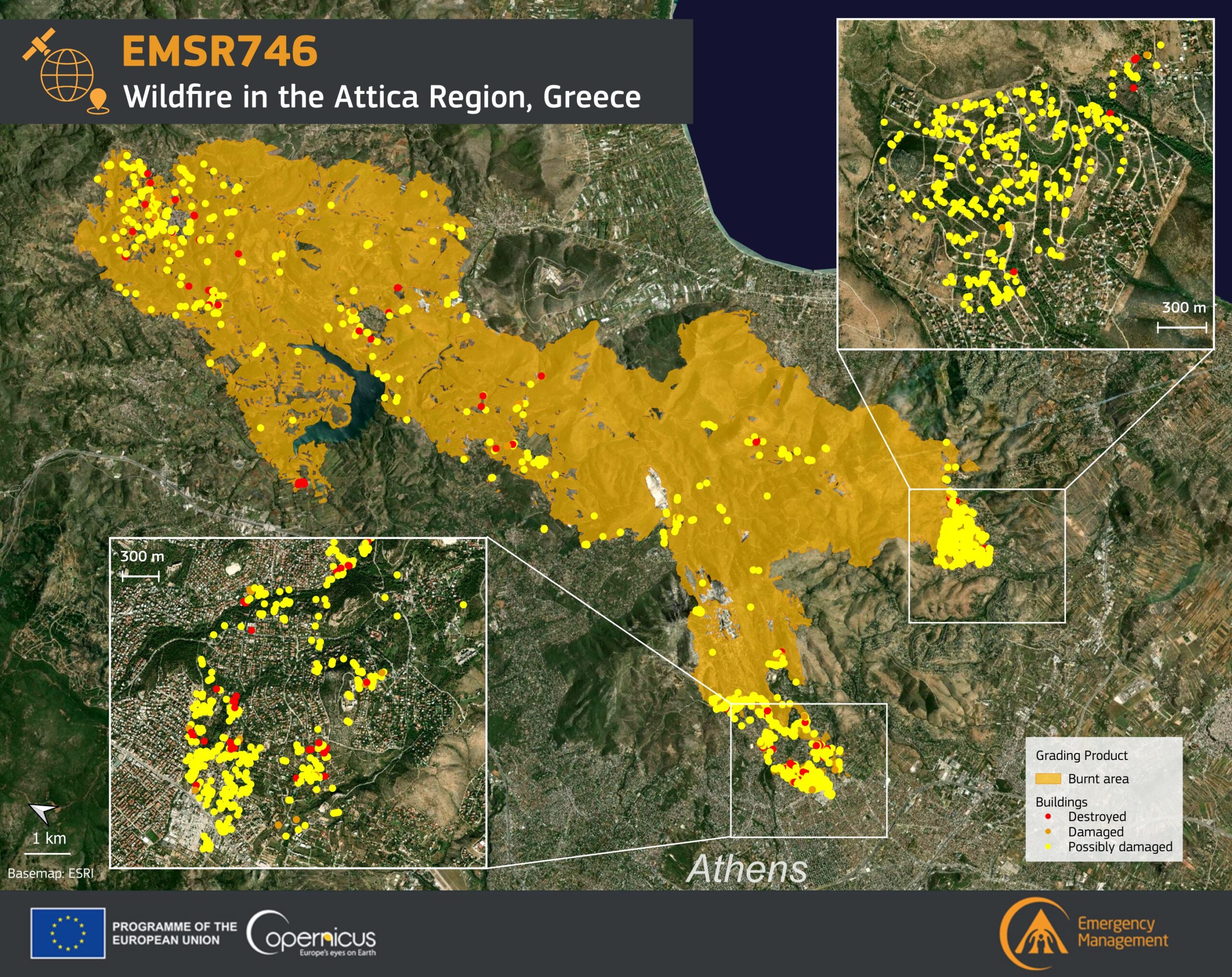 Ενας νέος χάρτης που δημοσιεύτηκε από το Copernicus δείχνει τη συνολική καταγραφή της καταστροφής που άφησε πίσω η φωτιά στη βορειανατολική Αττική.