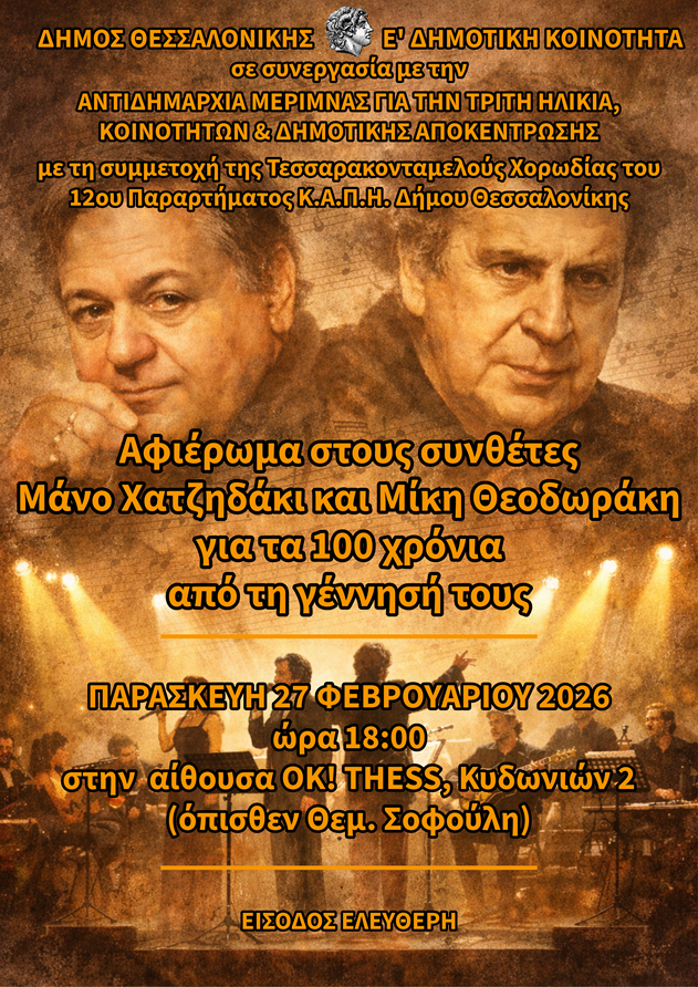 Ο Δήμος Θεσσαλονίκης, η Αντιδημαρχία Μέριμνας για την Τρίτη Ηλικία, Κοινοτήτων και Δημοτικής Αποκέντρωσης και η Ε΄ Δημοτική Κοινότητα διοργανώνουν μουσική εκδήλωση με τίτλο: «Αφιέρωμα στους συνθέτες Μάνο Χατζηδάκι και Μίκη Θεοδωράκη για τα 100 χρόνια από την γέννησή τους» την Παρασκευή 27 Φεβρουαρίου 2026 και ώρα 18:00, στον χώρο του OKThess (Κυδωνιών 2 – όπισθεν Θεμιστοκλή Σοφούλη 30).