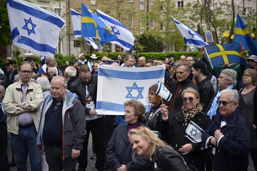 epa11329445 Pro-Israel demonstrators gather to support Israel's Eurovision contestant Eden Golan at Davidhallstorg in Malmo, Sweden, 09 May 2024. A protest against Israel's participation in the 68th edition of the Eurovision Song Contest (ESC) was held in the same time at the Malmo Arena. The ESC comprises two semi-finals, held on 07 and 09 May, and a grand final on 11 May 2024. EPA/JOHAN NILSSON SWEDEN OUT