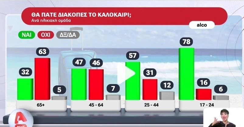 Σε δημοσκόπηση της Alco που παρουσιάστηκε στο δελτίο του Alpha καταγράφεται η τάση των Ελλήνων σχετικά με τις φετινές διακοπές, με τα ευρήματα να είναι άκρως αρνητικά.