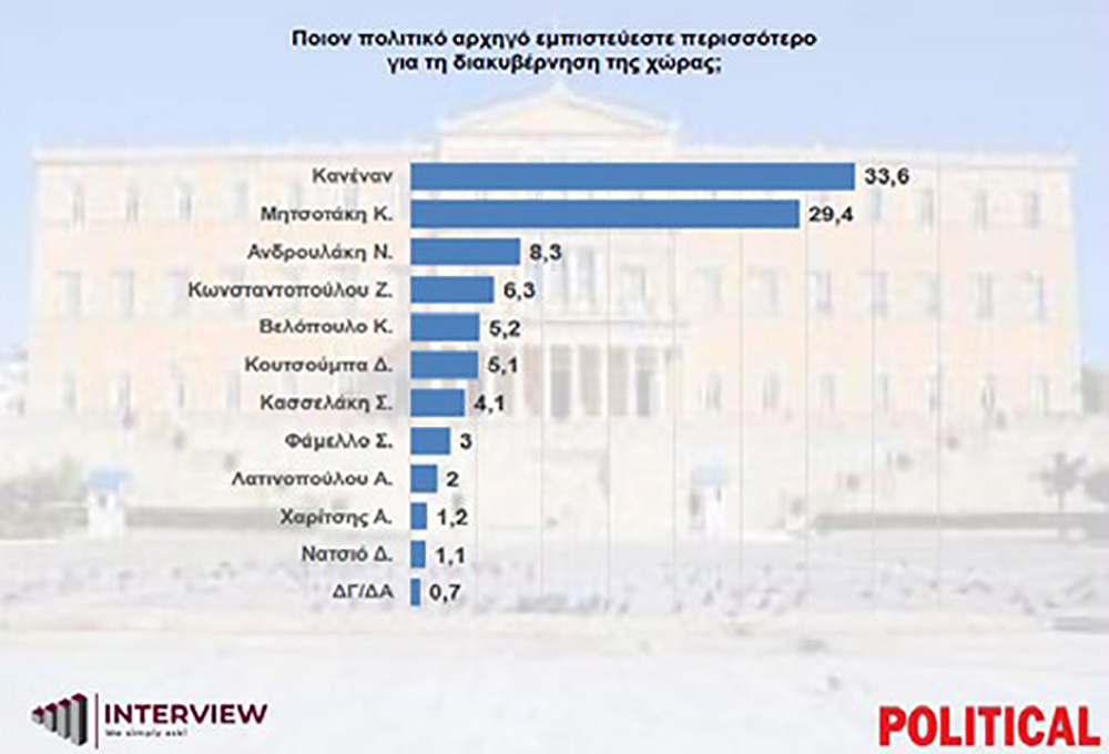 Στην ερώτηση «ποιον πολιτικό αρχηγό εμπιστεύεστε περισσότερο για τη διακυβέρνηση της χώρας», το 33,6% απαντά «κανέναν». Εν συνεχεία, ο πρωθυπουργός έρχεται πρώτος μεταξύ των υπόλοιπων πολιτικών αρχηγών με ποσοστό 29,4% και ακολουθούν οι Νίκος Ανδρουλάκης με 8,3%, Ζωή Κωνσταντοπούλου με 6,3%, Κυριάκος Βελόπουλος με 5,2%, Δημήτρης Κουτσούμπας με 5,1%, Στέφανος Κασσελάκης με 4,1%, Σωκράτης Φάμελλος με 3%, Αφροδίτη Λατινοπούλου με 2%, Αλέξης Χαρίτσης με 1,2%, Δημήτρης Νατσιός με 1,1%, ενώ 0,17% απαντά «δεν ξέρω/δεν απαντώ».