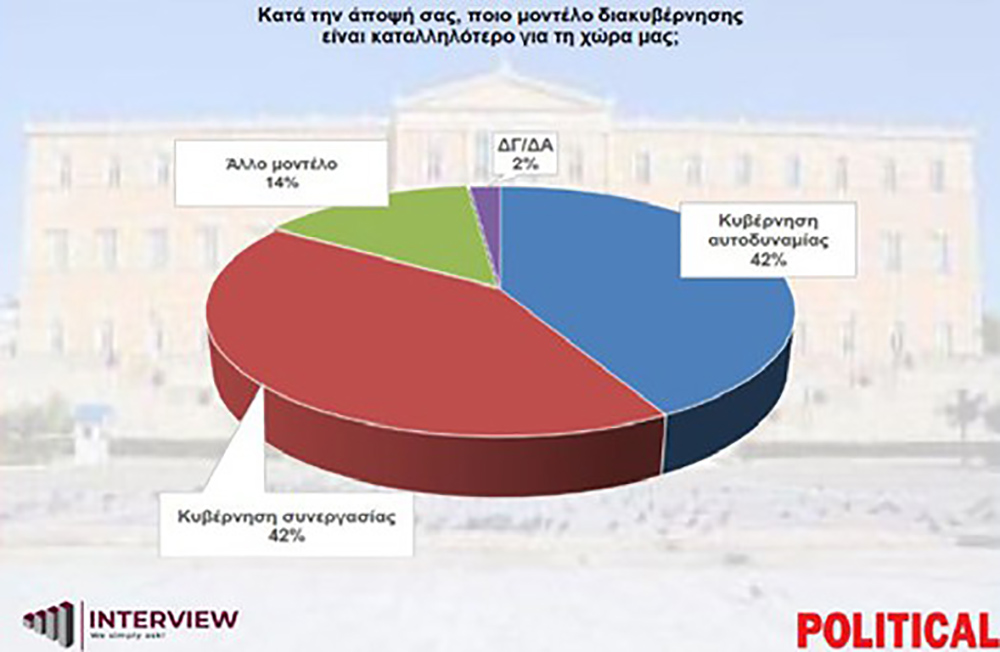 Μεγάλο ενδιαφέρον έχει και η αλλαγή που καταγράφεται στη δημοσκόπηση και αφορά πλέον στη διαχρονική άποψη των πολιτών υπέρ των αυτοδύναμων κυβερνήσεων, αφού στην ερώτηση «κατά την άποψή σας, ποιο μοντέλο διακυβέρνησης είναι καταλληλότερο για τη χώρα μας;», οι απαντήσεις δίνουν ισόποσα ποσοστά με το 42% να τάσσεται υπέρ κυβέρνησης συνεργασίας, το 42% να είναι υπέρ μιας αυτοδύναμης κυβέρνησης, το 14% υπέρ άλλου μοντέλου διακυβέρνησης και 2% «δεν ξέρω/δεν απαντώ».