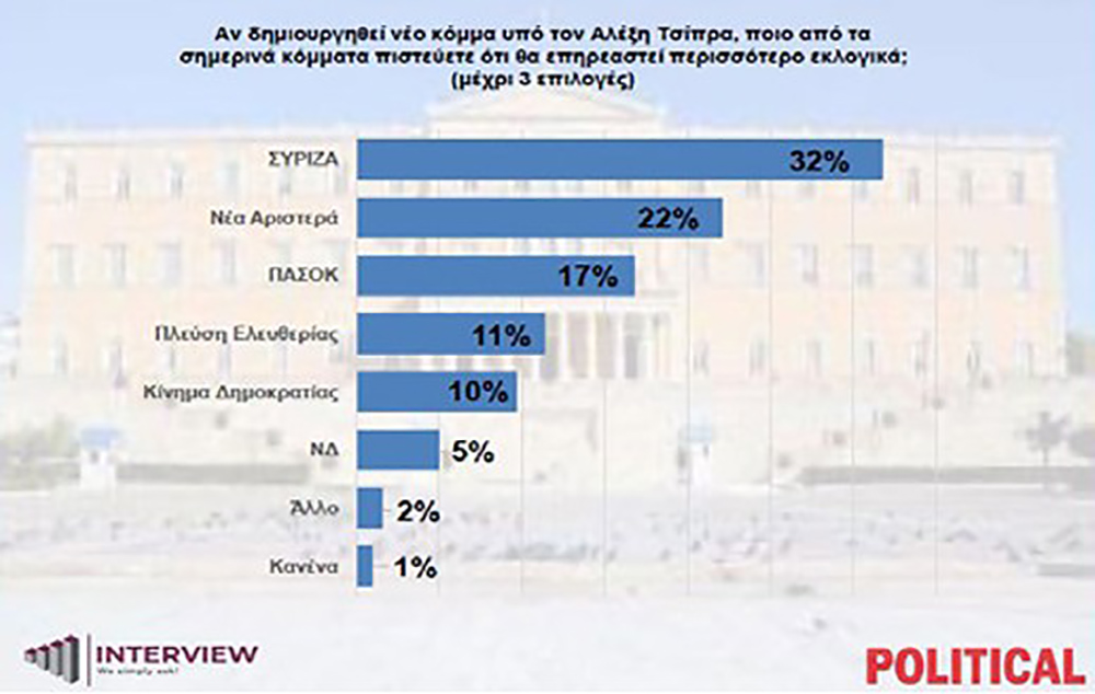 Στην ερώτηση «αν ο Αλ. Τσίπρας δημιουργούσε ένα νέο πολιτικό κόμμα, πόσο πιθανό θα ήταν να το ψηφίσετε;», τα ποσοστά των απαντήσεων κινούνται περίπου στα όρια εκείνων που είχε ο ΣΥΡΙΖΑ, όταν ο ίδιος αποφάσισε να παραιτηθεί μετά τις αλλεπάλληλες ήττες του ΣΥΡΙΖΑ και να δρομολογήσει τη διαδοχή του.