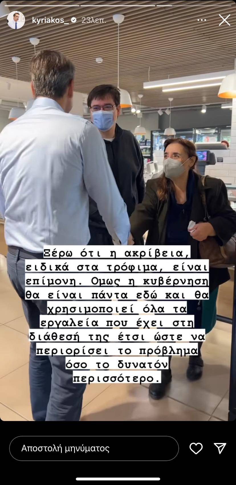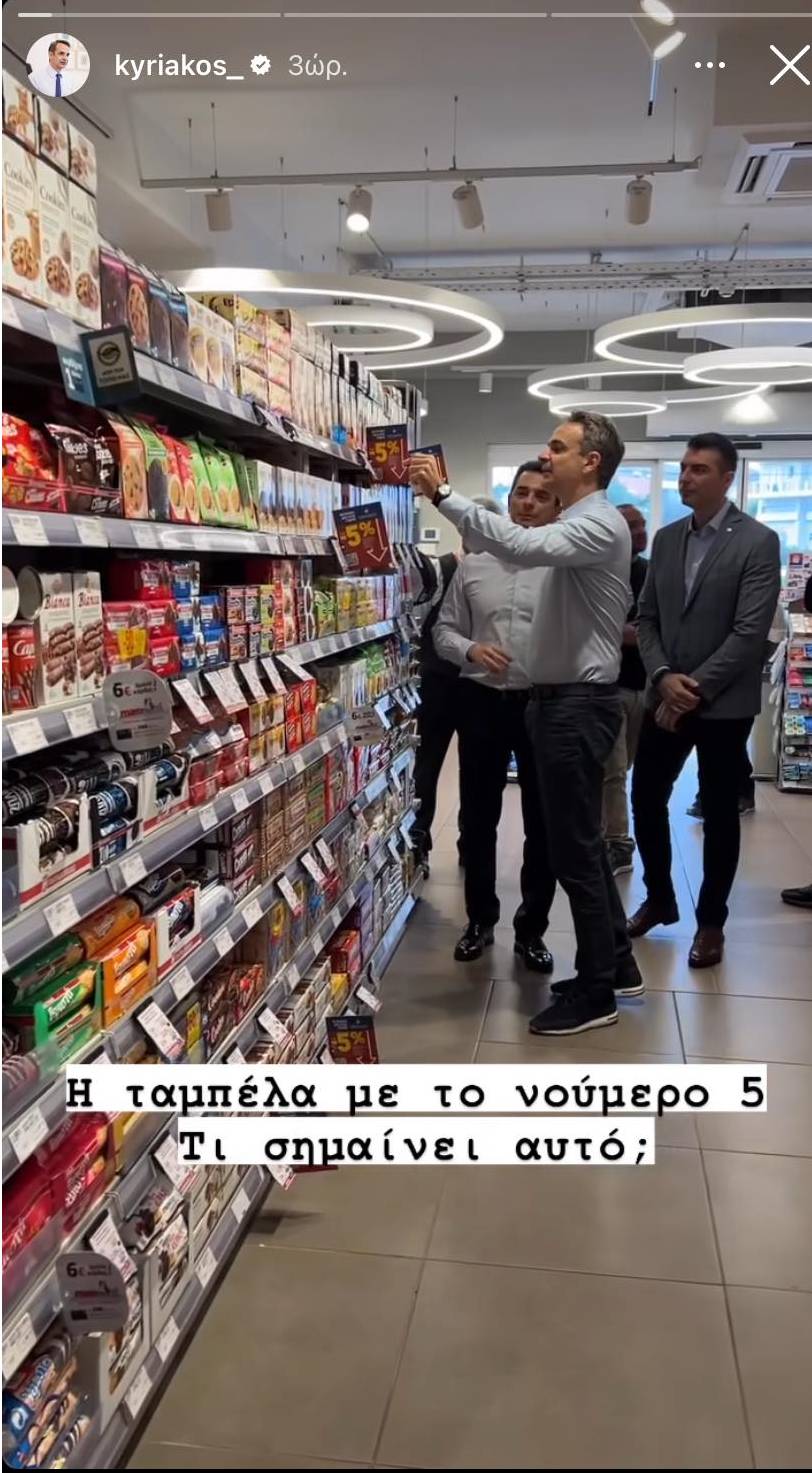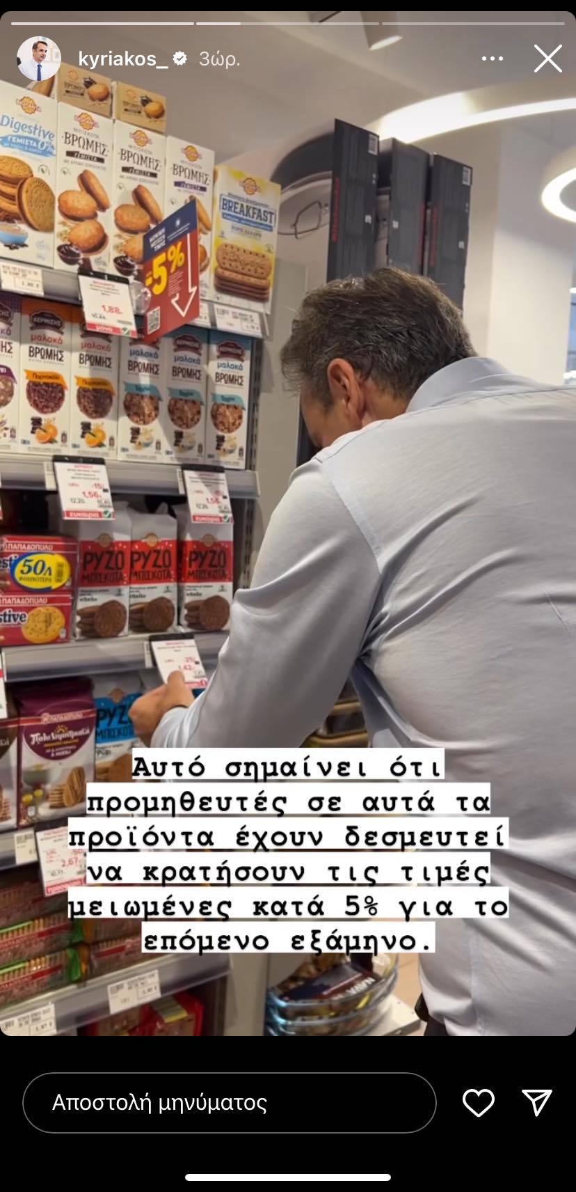 Λίγο μετά την επίσκεψη σε σούπερ μάρκετ με τον υπουργό ανάπτυξης Κώστα Σκρέκα ανέβασε τρία διαδοχικά story με βίντεο στο λογαριασμό του στο Instagram στα οποία παρουσιάζει τι σημαίνει το ταμπελάκι στα προϊόντα με τη μόνιμη μείωση τιμής 5%. “Αυτό σημαίνει ότι προμηθευτές σε αυτά τα προϊόντα έχουν δεσμευτεί να κρατήσουν τις τιμές μειωμένες κατά 5% για το επόμενο εξάμηνο”, διευκρινίζει ενώ σε συνομιλία με πελάτη αναφέρει ότι “θα αυξήσουμε τα προϊόντα στο 5%”.