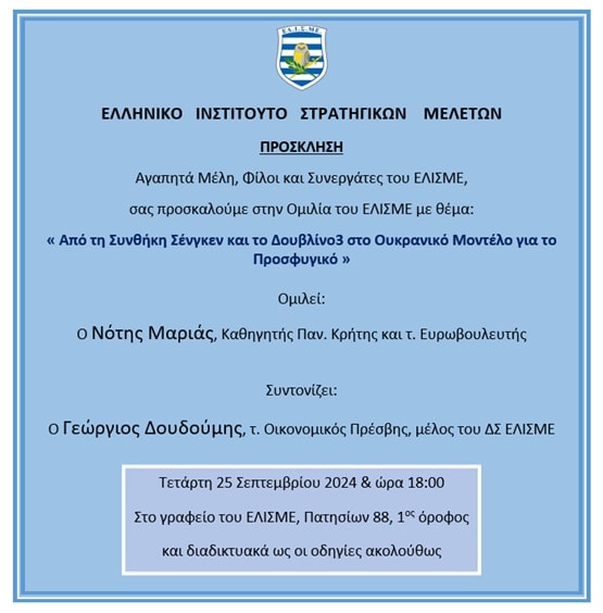 Το ΕΛΙΣΜΕ διοργανώνει την Τετάρτη 25 Σεπτεμβρίου 2024 στις 18.00 ημερίδα με θέμα: «Από τη Συνθήκη Σένγκεν και το Δουβλίνο 3 στο Ουκρανικό μοντέλο για το Προσφυγικό» Θα μιλήσει ο Νότης Μαριάς, καθηγητής Παν. Κρήτης και τ. ευρωβουλευτής. Η εκδήλωση θα πραγματοποιηθεί στα γραφεία του ΕΛΙΣΜΕ, Πατησίων 88 (1ος όροφος) ενώ μπορείτε να την παρακολουθήσετε και διαδικτυακά.