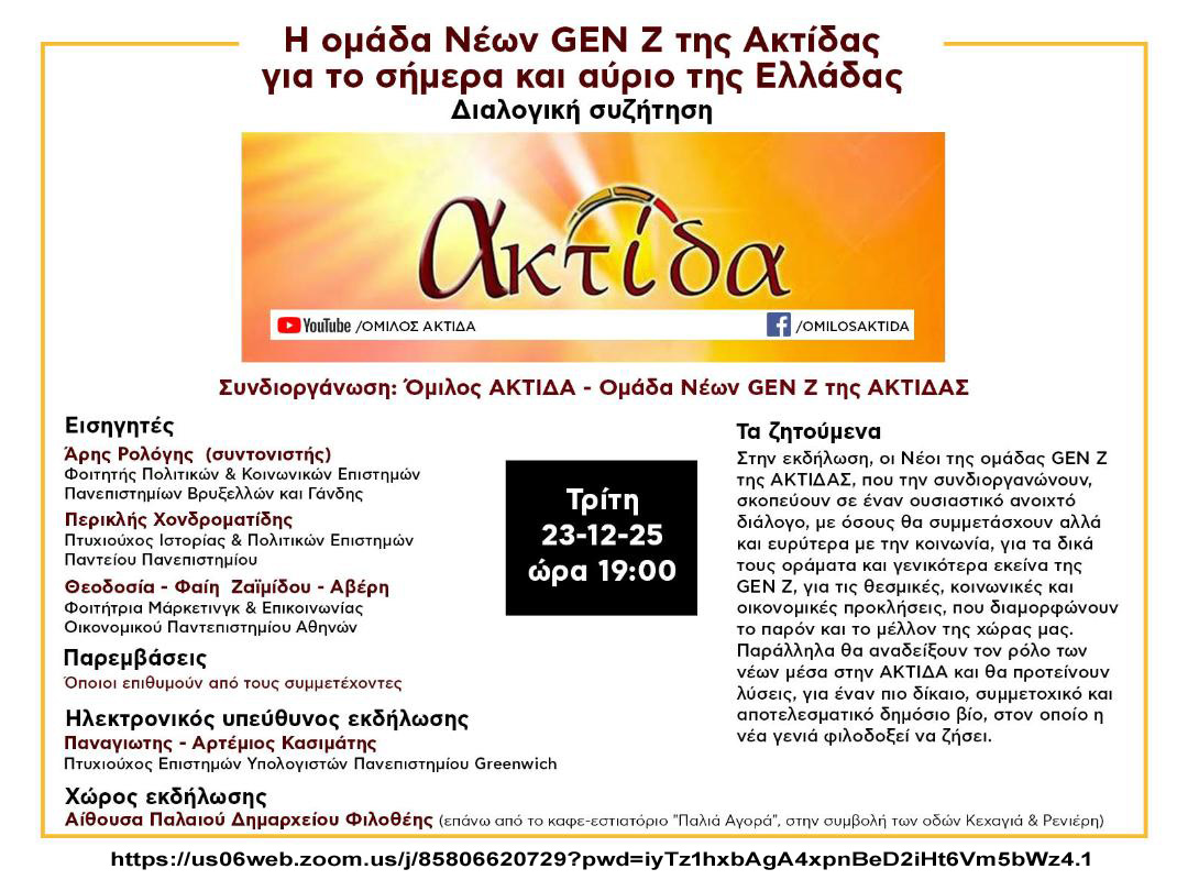 Ο Όμιλος ΑΚΤΙΔΑ διοργανώνει εκδήλωση – διαλογική συζήτηση, την Τρίτη 23 Δεκεμβρίου 2025, ώρα 19.00 με θέμα «Ομάδα των GEN Z της ΑΚΤΙΔΑΣ για το σήμερα και αύριο της Ελλάδας».