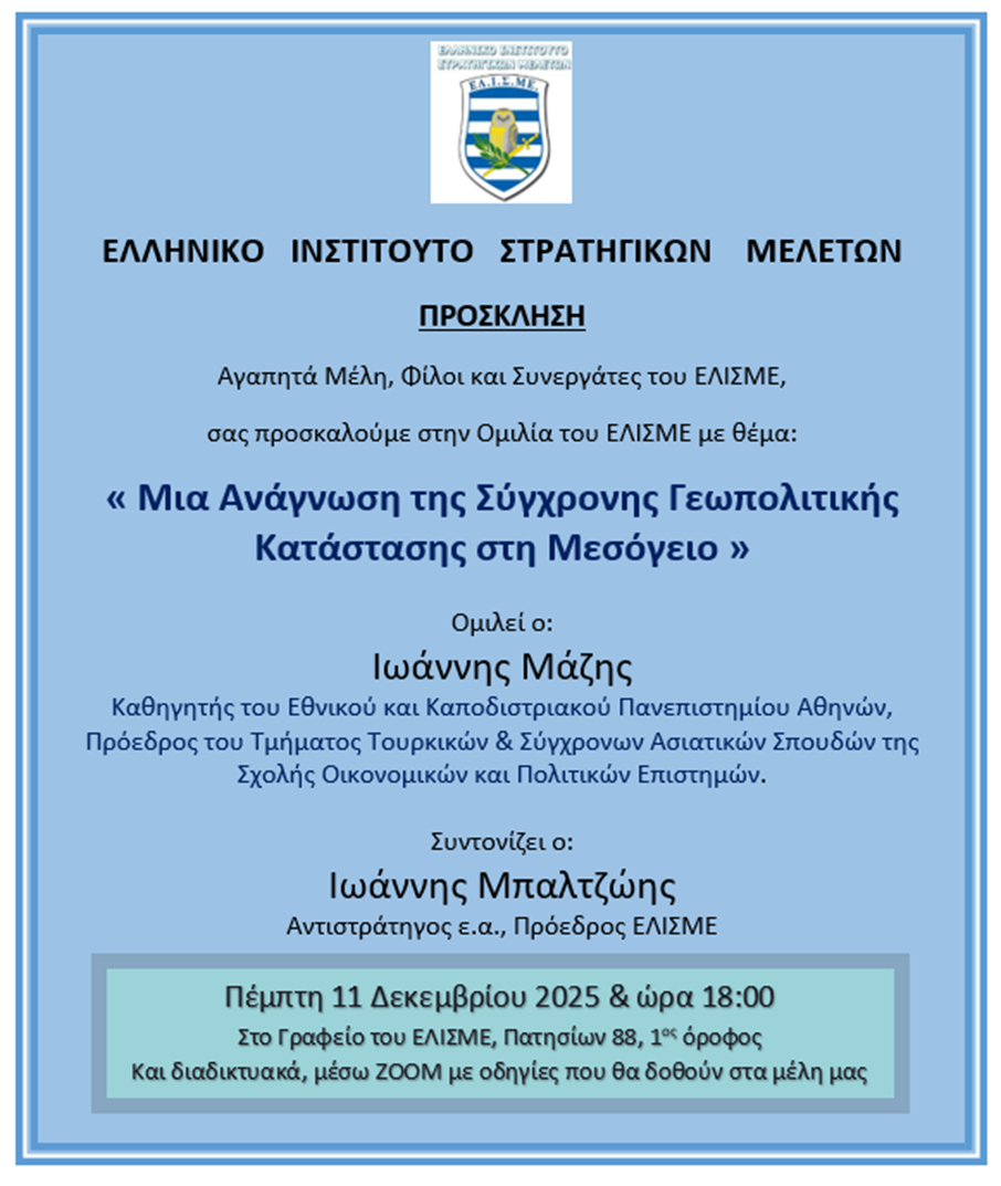 Θα μιλήσει ο καθηγητής Ιωάννης Μάζης και συντονίζει ο αντιστράτηγος Ιωάννης Μπαλτζώης, πρόεδρος του ΕΛΙΣΜΕ.
