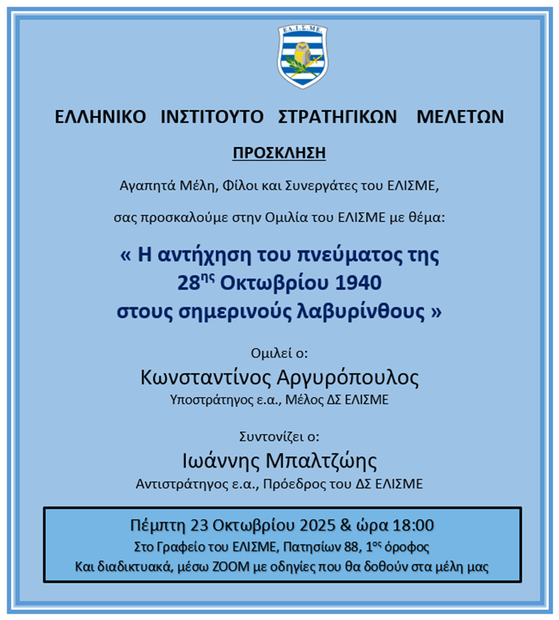 H Ομιλία στο ΕΛΙΣΜΕ με θέμα «TH αντήχηση του πνεύματος της 28ης Οκτωβρίου 1940 στους σημερινούς λαβυρίνθους» θα διεξαχθεί στα Γραφεία ΕΛΙΣΜΕ (Πατησίων 88-1ος όροφος) την Πέμπτη 23 Οκτωβρίου στις 18:00 και θα μεταδοθεί ηλεκτρονικά μέσω ΖΟΟΜ αλλά και Διαδικτυακά μέσω YouTube.