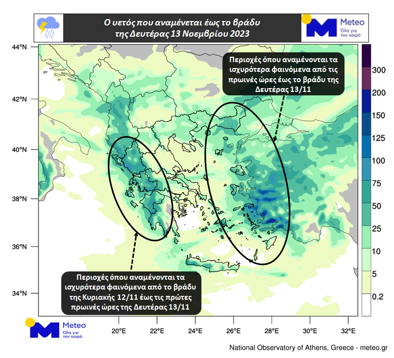 γ. Από τις προμεσημβρινές ώρες της Δευτέρας (13-11-23) μέχρι τις πρώτες βραδινές ώρες η Θράκη, τα νησιά του βορείου και ανατολικού Αιγαίου και πιθανώς πρόσκαιρα οι Κυκλάδες και η ανατολική Μακεδονία.