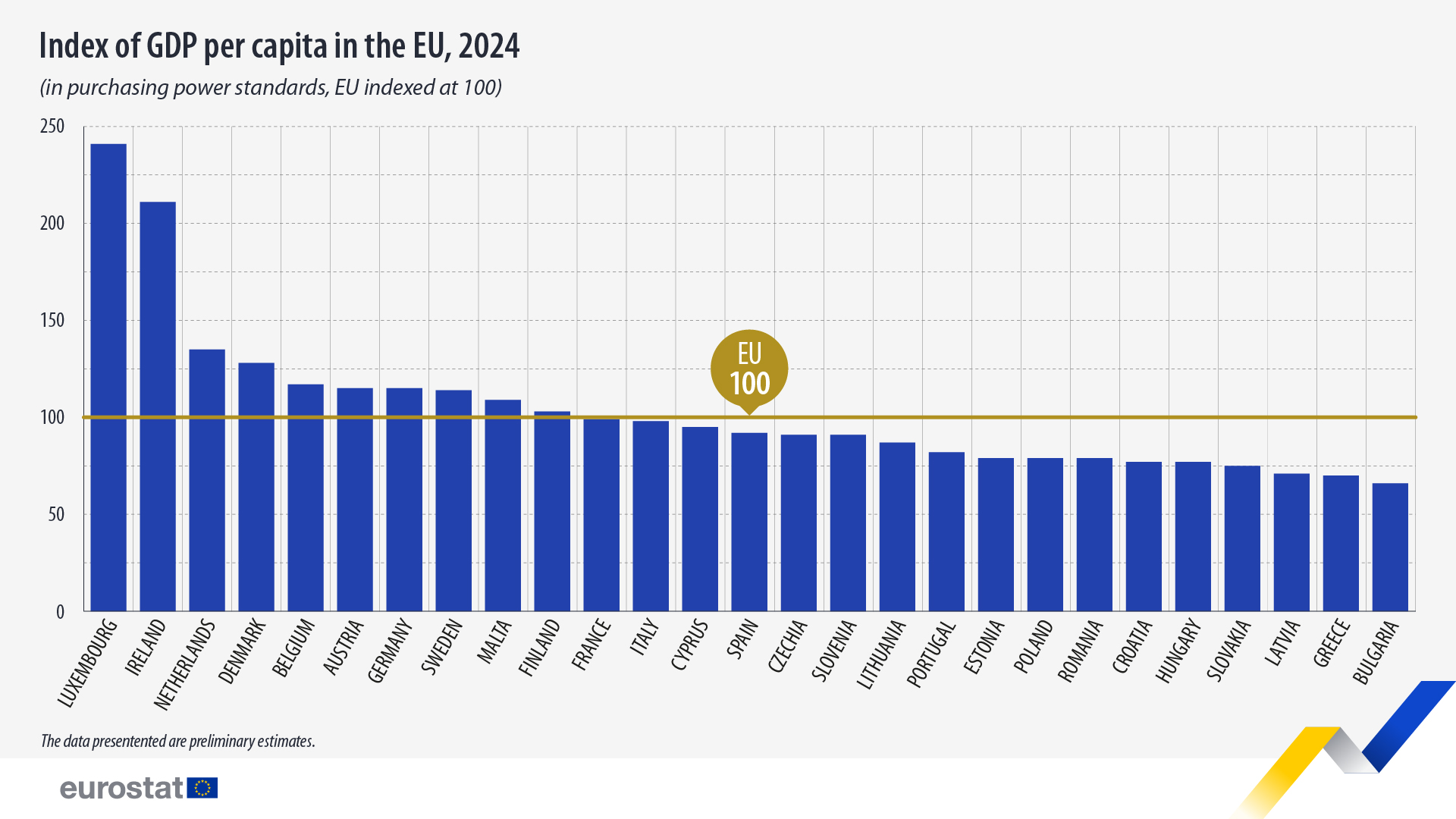 Το ΑΕΠ ανά κάτοικο, το οποίο υπολογίζεται με βάση την αγοραστική δύναμη, είναι σημαντικά υψηλότερο σε χώρες όπως το Λουξεμβούργο και η Ιρλανδία, οι οποίες ξεπερνούν τον μέσο όρο της ΕΕ κατά 141% και 111% αντίστοιχα.