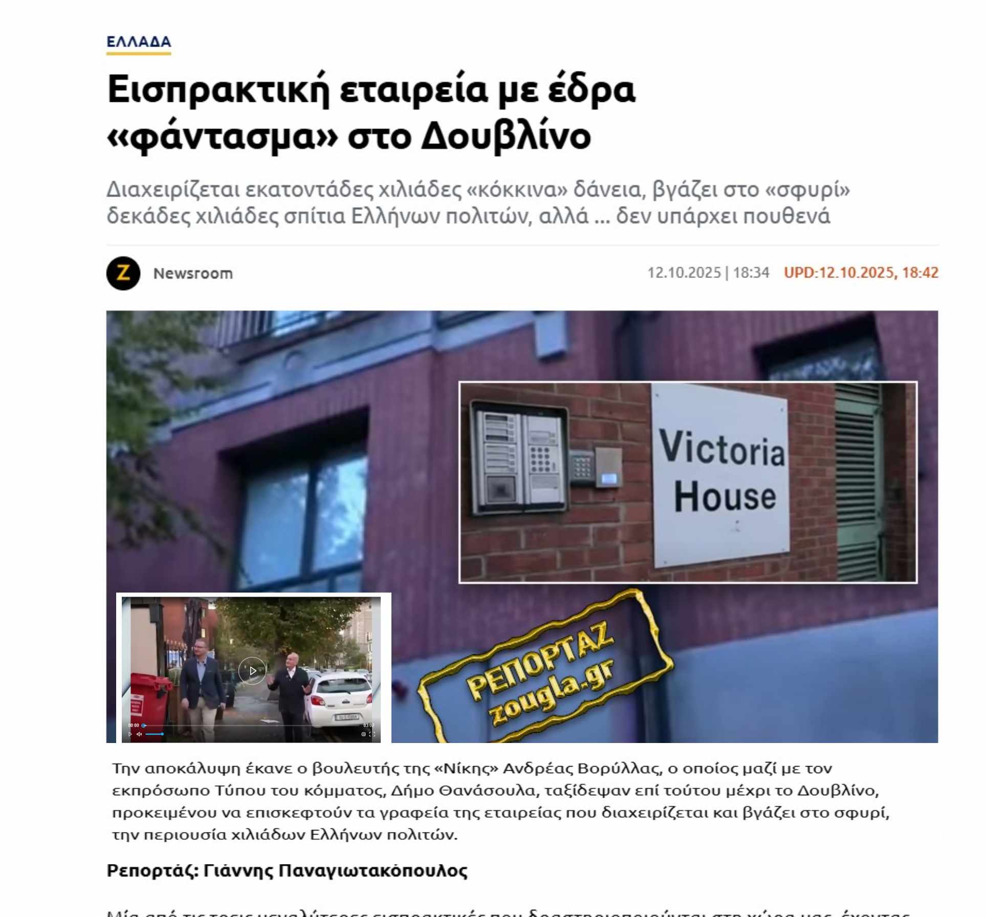 Η ΝΙΚΗ αποδεικνύει στην πράξη ότι η πολιτική μπορεί να έχει πρόσωπο, ευθύνη και θάρρος. Ο βουλευτής Ανδρέας Βορύλλας και ο εκπρόσωπος Τύπου του κόμματος Δήμος Θανάσουλας ταξίδεψαν στο Δουβλίνο της Ιρλανδίας, εκεί όπου εδρεύουν –τουλάχιστον στα χαρτιά– οι εταιρείες που διαχειρίζονται τα «κόκκινα» δάνεια των Ελλήνων πολιτών.