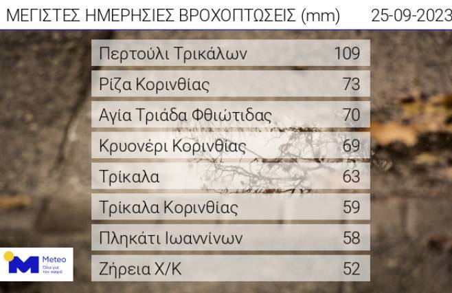 Την Τετάρτη (27-09-2023) κατά τόπους ισχυρές βροχές και καταιγίδες προβλέπονται στο Ιόνιο, την κεντρική και νότια ηπειρωτική χώρα (στη Θεσσαλία, τη Στερεά και την Πελοπόννησο), στις Σποράδες, την Εύβοια, τη δυτική Κρήτη και πιθανώς στις δυτικές Κυκλάδες. Επισημαίνεται ότι τα μεγαλύτερα ύψη βροχής θα σημειωθούν στους νομούς Καρδίτσας, Φθιώτιδας, στα ανατολικά τμήματα του νομού Μαγνησίας, στις Σποράδες και στη βόρεια Εύβοια.