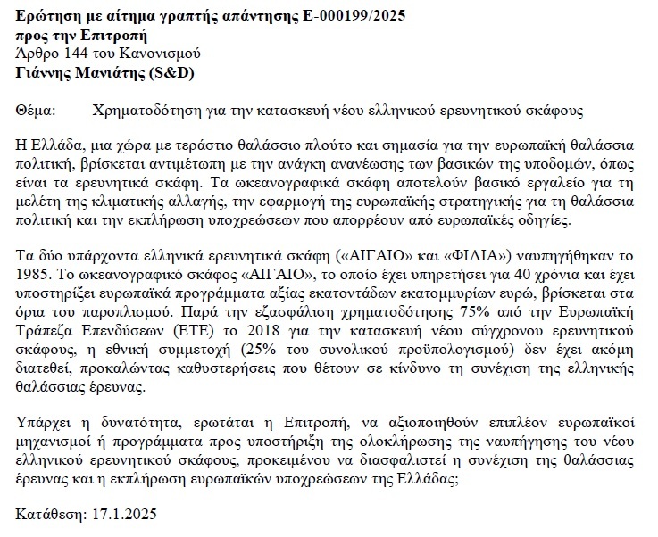 Ο Γιάννης Μανιάτης καλεί την Ελληνική Κυβέρνηση να προχωρήσει άμεσα στην καταβολή της εθνικής συμμετοχής που της αναλογεί, ώστε να προχωρήσει η ναυπήγηση του νέου ερευνητικού ωκεανογραφικού σκάφους.