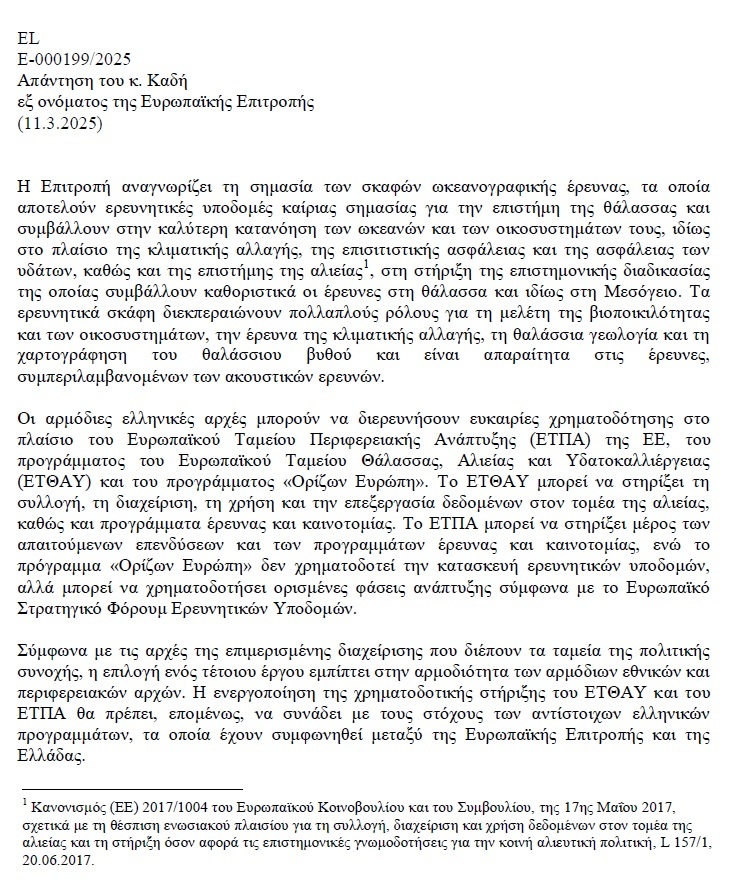 Ο Ευρωπαίος Επίτροπος τονίζει στην απάντησή του ότι υπάρχουν διαθέσιμες ευρωπαϊκές πηγές χρηματοδότησης, όπως το Ευρωπαϊκό Ταμείο Περιφερειακής Ανάπτυξης (ΕΤΠΑ), το Ευρωπαϊκό Ταμείο Θάλασσας, Αλιείας και Υδατοκαλλιέργειας (ΕΤΘΑΥ) και το πρόγραμμα «Ορίζων Ευρώπη».