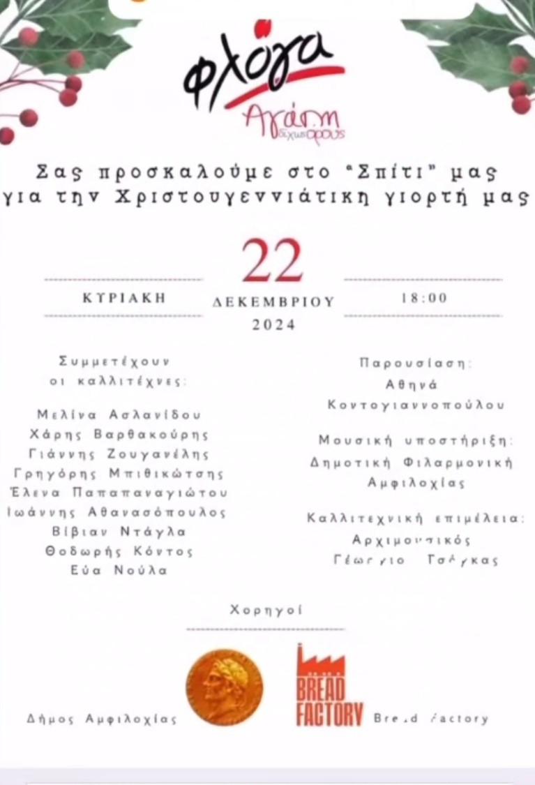 Η μουσική υποστήριξη θα είναι από την Δημοτική Φιλαρμονική Αμφιλοχίας που θα έρθει για αυτό τον σκοπό από την Αιτωλοακαρνανία , ενώ την εκδήλωση θα παρουσιάσει η Αθήνα Κοντογιαννοπούλου.