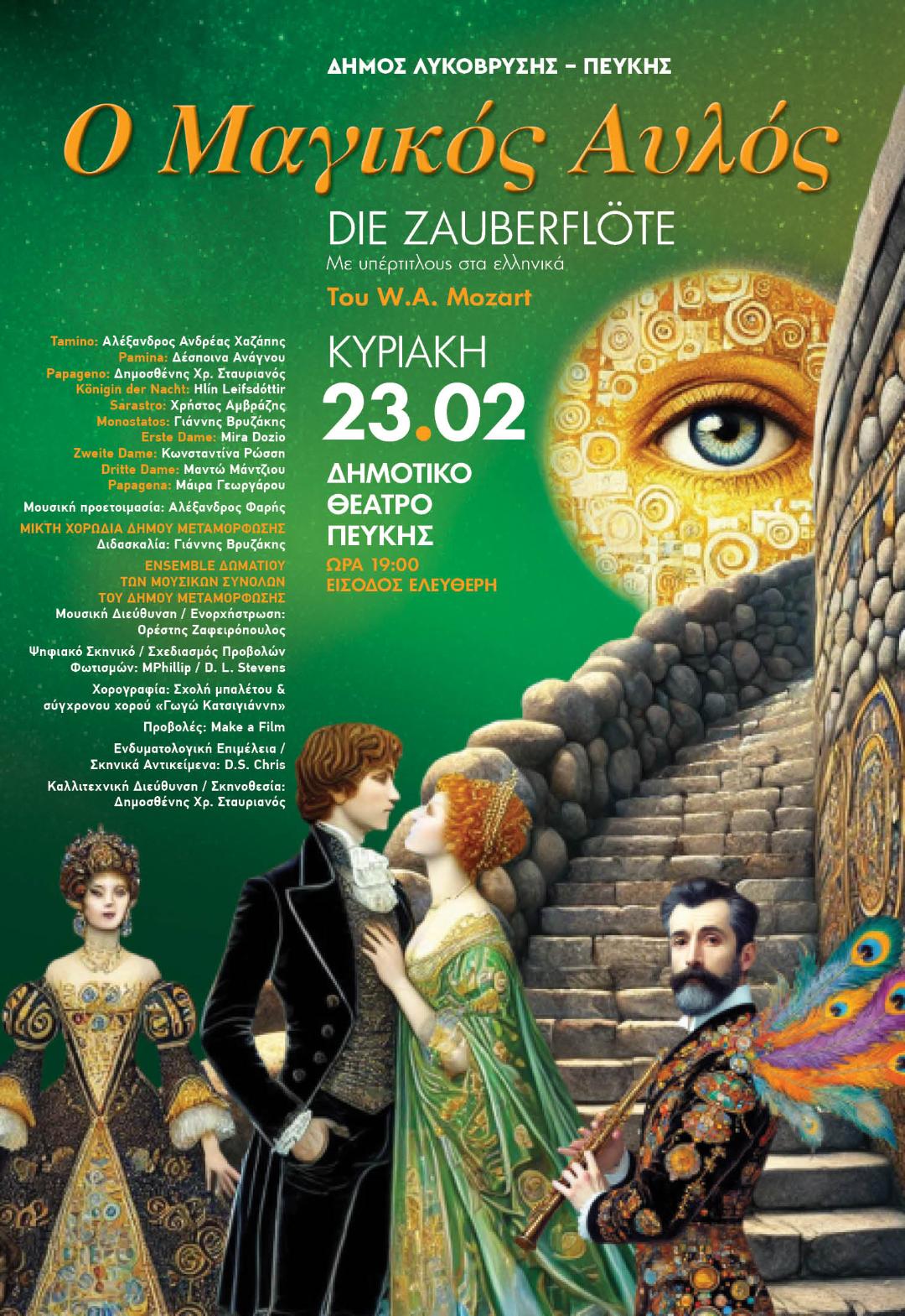 Η επιτυχημένη θεατρική παράσταση «Ο μαγικός Αυλός», του Βόλφγκανγκ Αμαντέους Μότσαρτ, επιστρέφει δυναμικά, σε μια μαγευτική παρουσίαση από τα Μουσικά Σύνολα του Δήμου, τις Χορωδίες και την Ορχήστρα Δωματίου. Την ορχήστρα διευθύνει ο εξαιρετικός μαέστρος Ορέστης Ζαφειρόπουλος. Η παράσταση θα πραγματοποιηθεί την Κυριακή 23 Φεβρουαρίου στις 19:00, στο Δημοτικό Θέατρο Πεύκης, με ελεύθερη είσοδο για το κοινό.