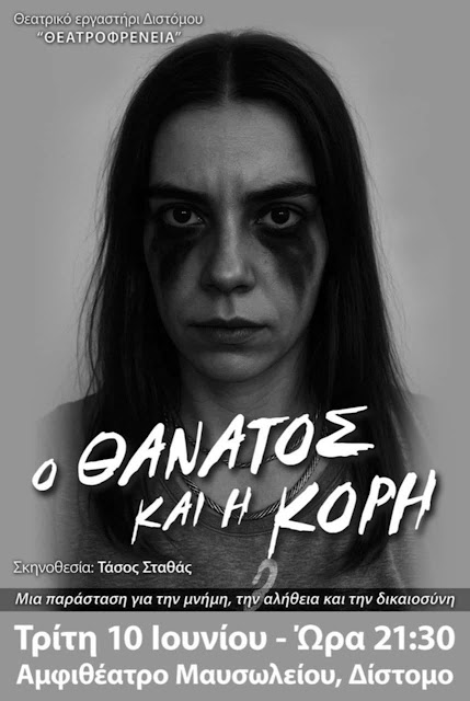 Την Τρίτη 10 Ιουνίου 2025 (στις 9.30 μ.μ.) στο ανοιχτό Αμφιθέατρο του Μαυσωλείου Διστόμου, το Θεατρικό Εργαστήρι «Θεατροφρένεια» παρουσιάζει το έργο «Ο Θάνατος και η κόρη» βασισμένο στην εμβληματική ταινία του Ρομάν Πολάνσκι, σε σκηνοθεσία Τάσου Σταθά.
