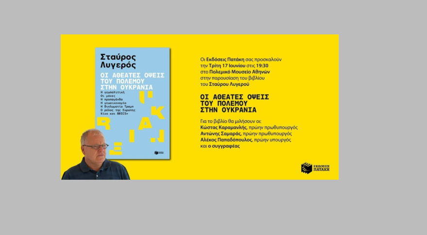 Οι Εκδόσεις Πατάκη σας προσκαλούν την Τρίτη 17 Ιουνίου στις 19:30 στην παρουσίαση του νέου βιβλίου του Σταύρου Λυγερού για το Ουκρανικό, με τίτλο «Οι αθέατες όψεις του πολέμου στην Ουκρανία».