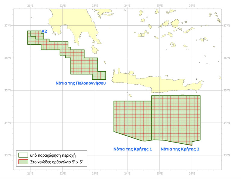 Ο διαγωνισμός για τις τέσσερις περιοχές ( «μπλοκ Α2», «Νότια της Πελοποννήσου», «Νότια της Κρήτης 1» και «Νότια της Κρήτης 2») προκηρύχθηκε ύστερα από ενδιαφέρον που εκδήλωσαν η Helleniq Energy για την πρώτη και η Chevron για τις άλλες τρεις. Την περασμένη Τετάρτη, με τη λήξη της προθεσμίας οι δυο εταιρείες κατέθεσαν από κοινού προσφορά και για τις τέσσερις περιοχές. Ήδη συγκροτήθηκε η επιτροπή αξιολόγησης των προσφορών και θα ακολουθήσουν η κατάρτιση, υπογραφή των συμβάσεων και η κύρωσή τους από τη Βουλή.