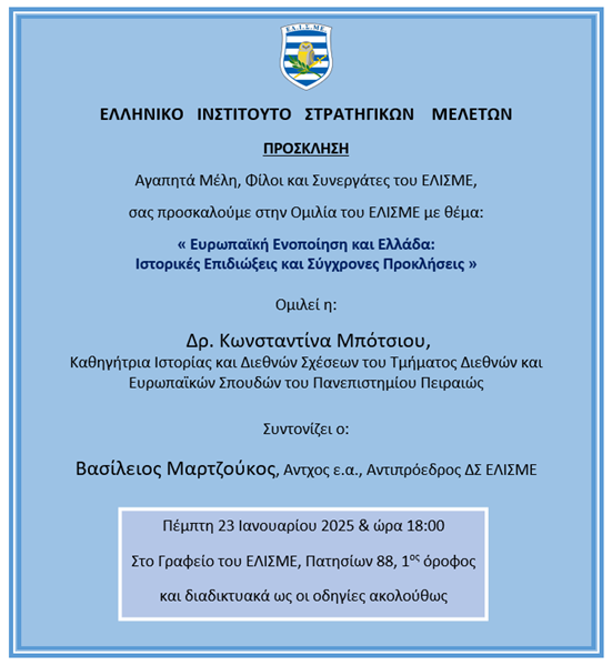 Θα μιλήσει η δρ. Κωνσταντίνα Μπότσιου, καθηγήτρια Ιστορίας και Διεθνών Σχέσεων του Τμήματος Διεθνών και Ευρωπαϊκών Σπουδών του Πανεπιστημίου Πειραιώς. Συντονίζει ο Βασίλειος Μαρτζούκος, αντχος ε.α., Αντιπρόεδρος ΔΣ ΕΛΙΣΜΕ.