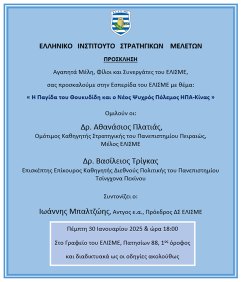 Το Ελληνικό Ινστιτούτο Στρατηγικών μελετών προσκαλεί τους φίλους του σε ομιλία στα γραφεία του (Πατησίων 88, 1ος όροφος), με θέμα “Η Παγίδα του Θουκυδίδη και ο νέος Ψυχρός Πόλεμος ΗΠΑ-Κίνας”, την Πέμπτη 30 Ιανουαρίου στις 6 το απόγευμα.