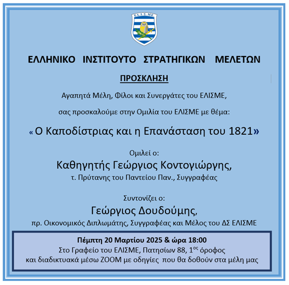 Το Ελληνικό Ινστιτούτο Στρατηγικών Μελετών σας προσκαλεί σε ομιλία στα γραφεία του (Πατησίων 88, 1ος όροφος), με θέμα “Ο Καποδίστριας και η Επανάσταση του 1821”, την Πέμπτη 20 Μαρτίου στις 6 το απόγευμα.