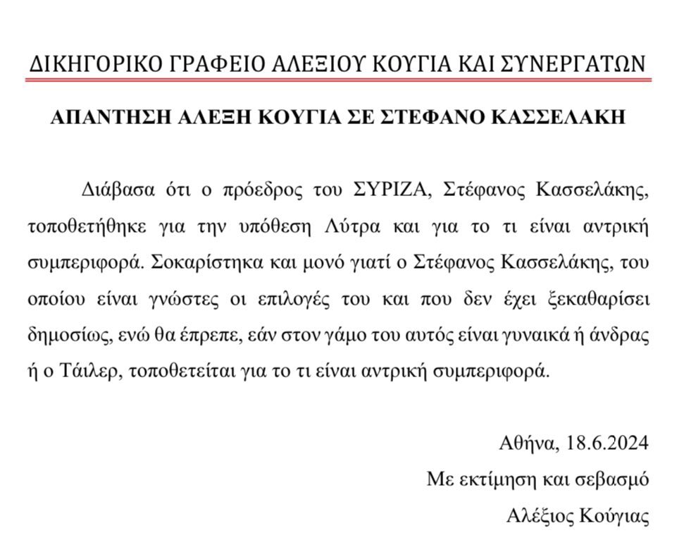 Τότε ο κ. Κουγιας ανήρτησε το εξής κείμενο: «Διάβασα ότι ο πρόεδρος του ΣΥΡΙΖΑ τοποθετήθηκε στην υπόθεση Λύτρα και για το τι είναι αντρική συμπεριφορά. Σοκαρίστηκα και μόνο γιατί ο Στέφανος Κασσελάκης, του οποίου είναι γνωστές οι επιλογές του και που δεν έχει ξεκαθαρίσει δημοσίως, ενώ θα έπρεπε, εάν στο γάμο του αυτός είναι γυναίκα ή άνδρας ή ο Τάιλερ, τοποθετείται για το είναι αντρική συμπεριφορά».