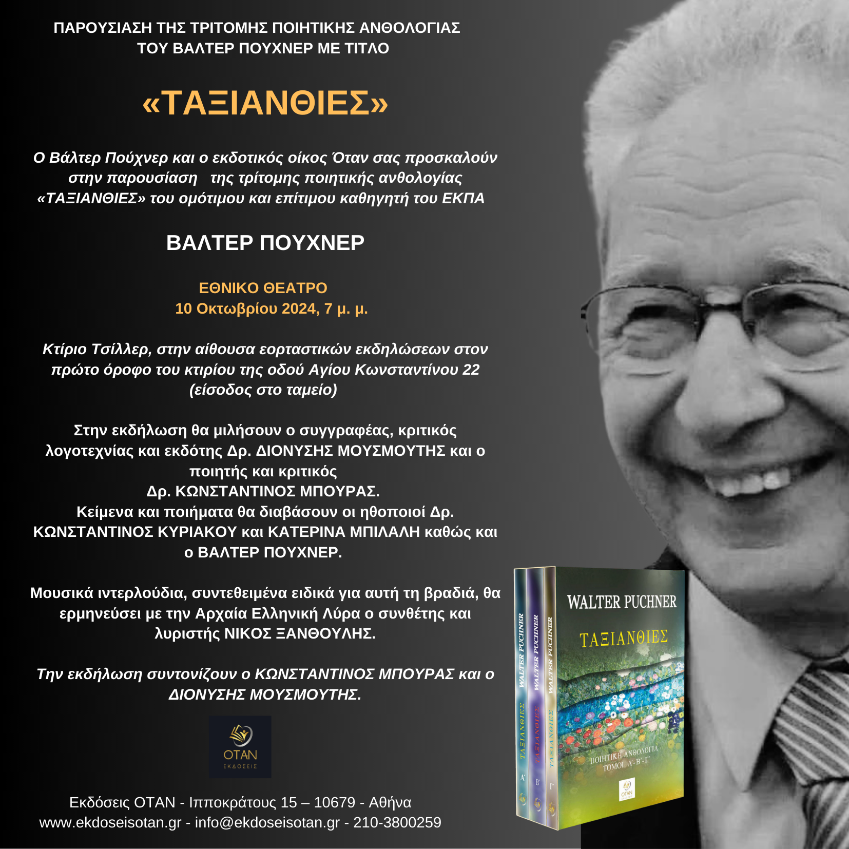 O Βάλτερ Πούχνερ και ο εκδοτικός οίκος Όταν σας προσκαλούν στην παρουσίαση της τρίτομης ποιητικής ανθολογίας «ΤΑΞΙΑΝΘΙΕΣ» του ομότιμου και επίτιμου καθηγητή του ΕΚΠΑ ΒΑΛΤΕΡ ΠΟΥΧΝΕΡ.