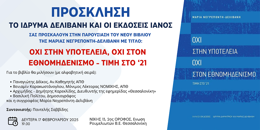Η παρουσία του βιβλίου της Μαρίας Νεγρεπόντη-Δελιβάνη “Όχι στην Υποτέλεια, Όχι στον εθνομηδενισμό – Τιμή στο ’21” θα πραγματοποιηθεί την Δευτέρα 17 Φεβρουαρίου στις 19.00 στην οδό Νίκης 13, στην Ένωση Ρουμελιωτών Β.Ε. Θεσσαλονίκη (2ος όροφος).