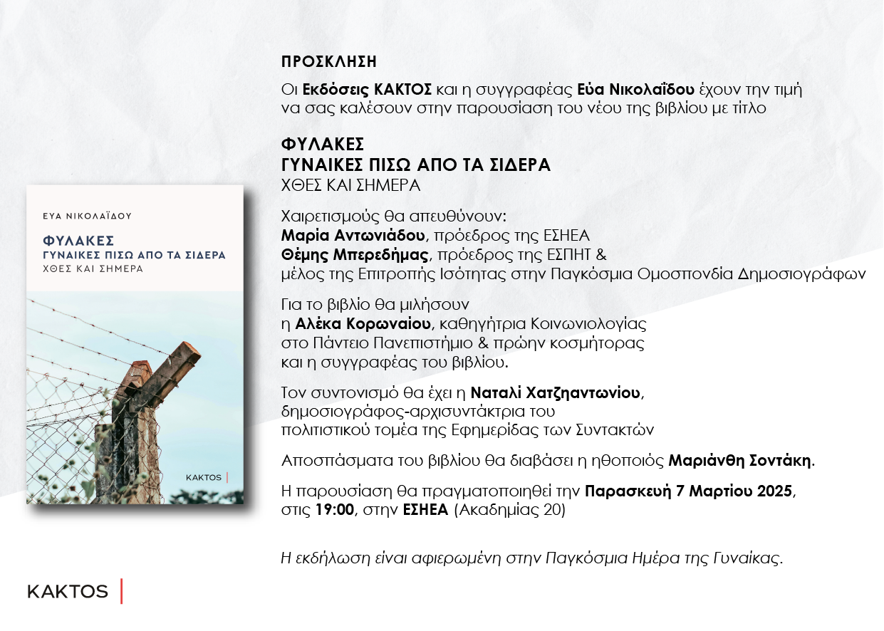 Με αφορμή την Παγκόσμια Ημέρα της Γυναίκας στις 8 Μαρτίου θα γίνει παρουσίαση του βιβλίου της Εύας Νικολαΐδου με τίτλo “ΦΥΛΑΚΕΣ – ΓΥΝΑΙΚΕΣ ΠΙΣΩ ΑΠΟ ΤΑ ΣΙΔΕΡΑ”. Η παρουσίαση του βιβλίου θα γίνει την Παρασκευή 7 Μαρτίου 2025, στις 19:00, στην ΕΣΗΕΑ (Ακαδημίας 20).