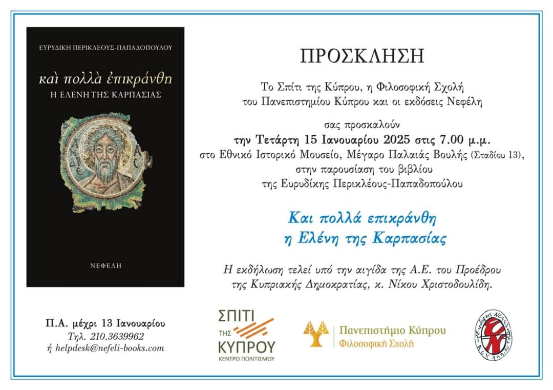 Η Ιστορική και Εθνολογική Εταιρεία της Ελλάδος – Εθνικό Ιστορικό Μουσείο, η Φιλοσοφική Σχολή του Πανεπιστημίου Κύπρου και οι εκδόσεις Νεφέλη σας προσκαλούν την Τετάρτη, 15 Ιανουαρίου 2025 στις 7.00 μ.μ. στο Εθνικό Ιστορικό Μουσείο, Μέγαρο Παλαιάς Βουλής (Σταδίου 13), στην παρουσίαση του βιβλίου της Ευρυδίκης Περικλέους-Παπαδοπούλου “Και πολλά επικράνθη η Ελένη της Καρπασίας”