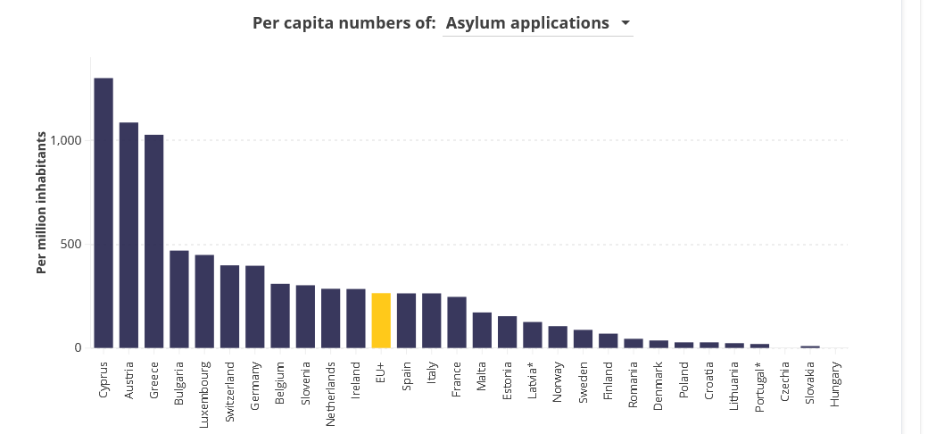 Είναι ενδιαφέρον ότι η έκθεση που συντάχθηκε από την αρμόδια ευρωπαϊκή υπηρεσία ασύλου αναφέρεται και στον όγκο μεταναστών ανάλογα με τον πληθυσμό της φιλοξενούσας χώρας, τονίζοντας ότι είναι πολύ διαφορετικά τα δεδομένα όταν ακόμα και σχετικά μικρός αριθμός μεταναστών φιλοξενείται σε μικρή χώρα. Οπότε τον μεγαλύτερο όγκο σε σχέση με τον ντόπιο πληθυσμό φέρεται να τον δέχεται η Κύπρος, με δεύτερη την Αυστρία και τρίτη την Ελλάδα και μάλιστα με μεγάλη διαφορά προς τις υπόλοιπες χώρες