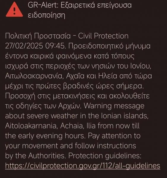 Εν όψει της επιδείνωσης που αναμένεται να παρουσιάσει ο καιρός, εστάλη 112 σε όσους βρίσκονται σε νησιά του Ιονίου, σε Αιτωλοακαρνανία, Αχαΐα και Ηλεία.
